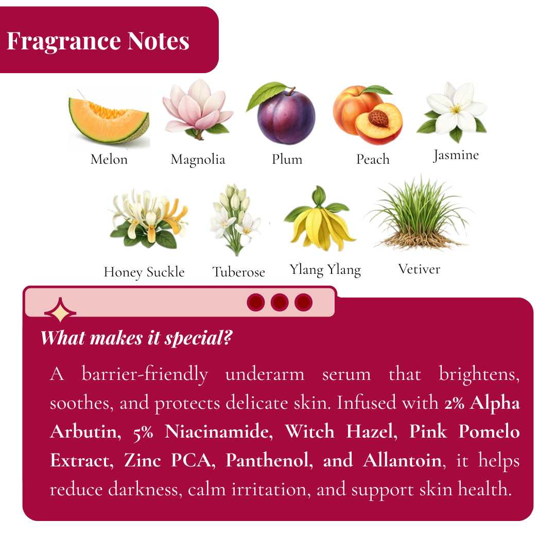 A lightweight, fast-absorbing underarm serum designed to brighten, soothe, and support delicate skin. Powered by Alpha Arbutin, Niacinamide, Zinc PCA, Panthenol, and Allantoin, it helps improve the appearance of uneven tone while supporting odor control — without disrupting the skin barrier.